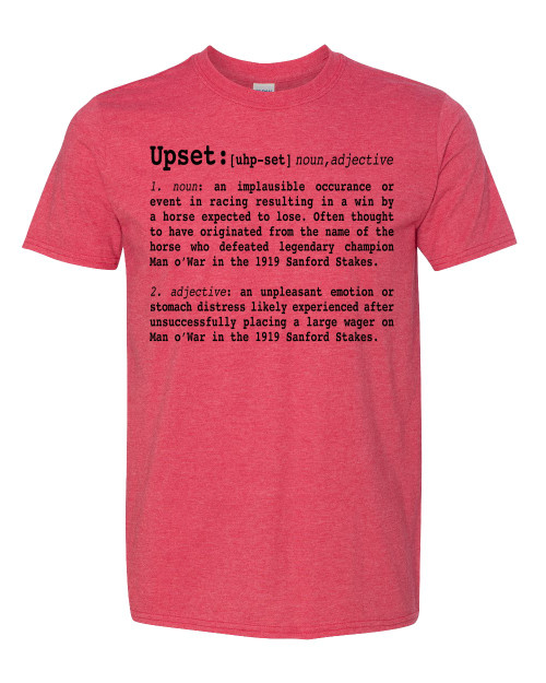 The "Upset" Definition Shirt's design is inspired by the familiar look found in a dictionary definition, and pays tribute to the original "Upset" -- the horse who stunned the racing world by defeating the legendary champion Man o' War in the 1919 Sanford Stakes at Saratoga -- an event that helped catapult and popularize the word as a staple term in the lexicon of every sport.